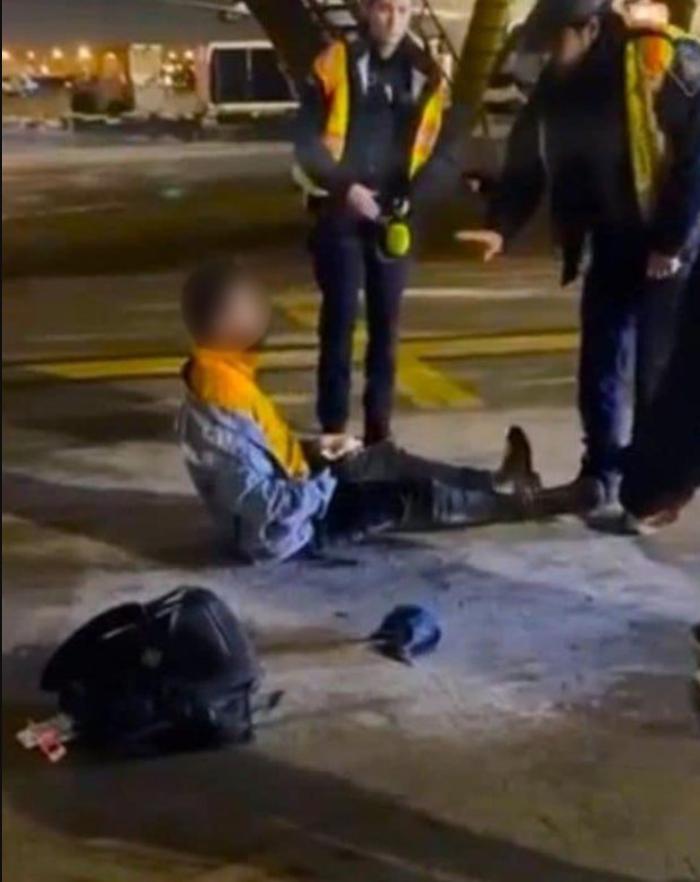 警方发言人称,经调查这名乘客摔倒在停机坪上受了伤,需要紧急送医。警方证实该男子被当场逮捕,并被送往当地医院接受必要的治疗。护理人员称患者没有生命危险。