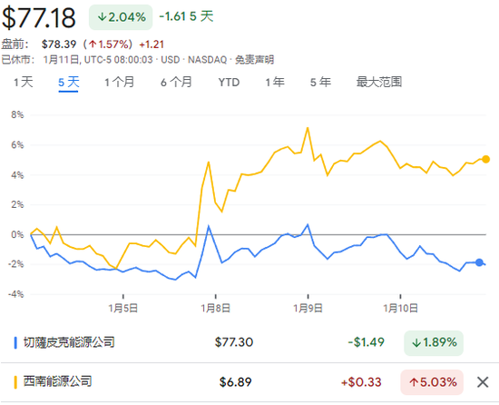 切萨皮克美股盘前涨1.57%,西南能源跌近3%,自上周媒体报道两者谈判以来,后者累计涨超5%。