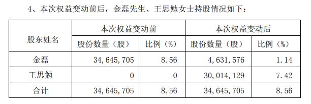 本次权益变动后,金磊持有公司463.15万股股份,约占公司总股本1.14%,不再是公司持股5%以上股东;王思勉持有公司3001.41万股股份,约占公司总股本7.42%,成为公司持股5%以上股东。