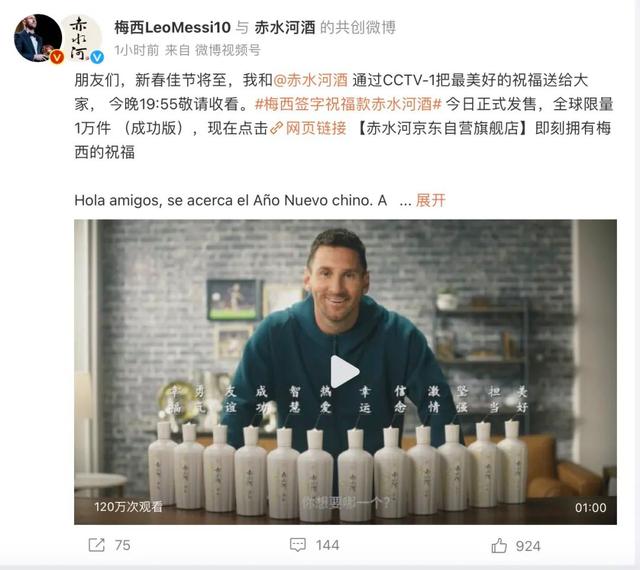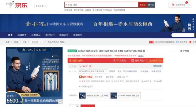 1月11日,梅西实名认证微博号发文称,梅西签字祝福款赤水河酒今日正式发售,全球限量1万件(成功版)。据赤水河京东自营旗舰店信息显示,该产品为53度酱香型白酒,每瓶500ml,6瓶整箱装售价为6600元,限量1万瓶。