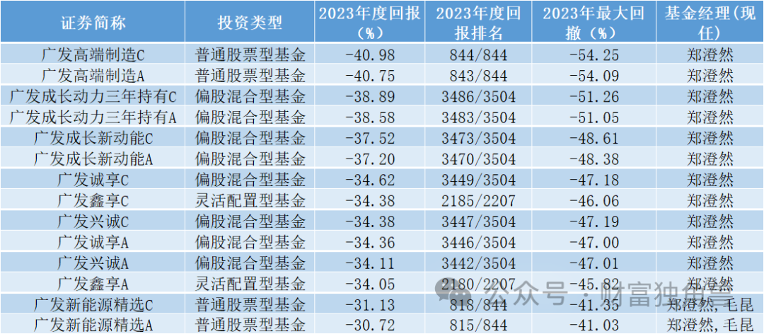 广发基金经理郑澄然共管理了14只基金,2023年14只基金全线溃败,平均跌幅高达35.83%,基金代表作广发高端制造股票A 2023年收益为-40.75%,在同期844只普通股票型基金中排名倒数第二,倒数第一是广发高端制造股票C。