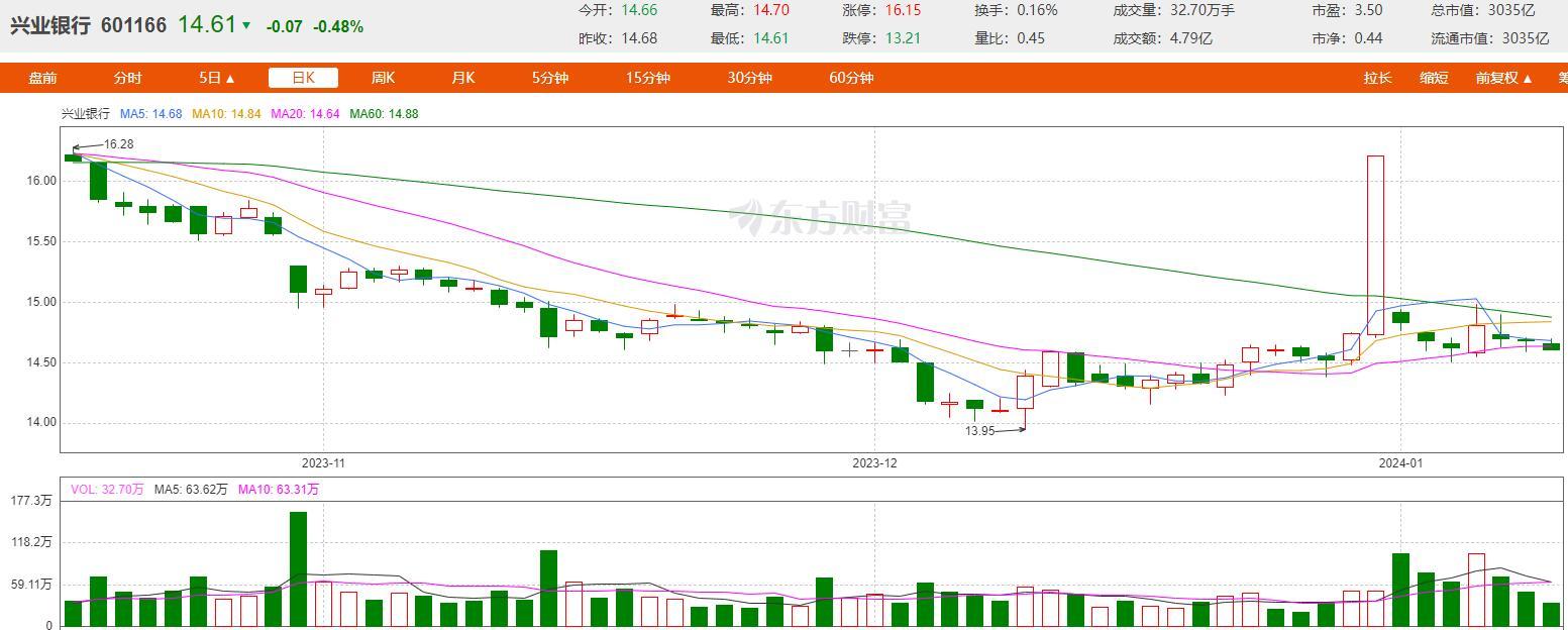 截至2023年11月30日,福建港口集团及其子公司合并持有兴业银行股票约5.8亿股。2023年12月28日,兴业银行报收于14.74元/股,而该价格处于2021年以来兴业银行股价的低价区间。但到了12月29日收盘时,经历了涨停之后的兴业银行最终在2023年底报收于16.21元/股。