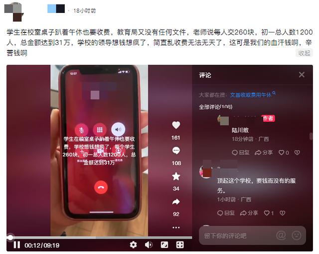 近日,有家长在网上爆料称,孩子在广西玉林市陆川县文昌中学读书,每学期需要收取260元的午休费用,“实际上孩子就是趴在桌子上睡。”