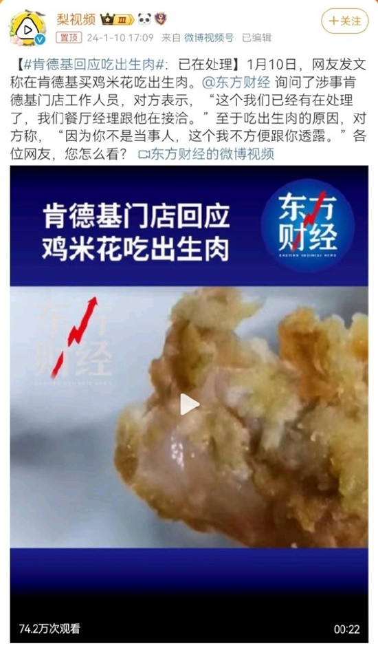 据梨视频报道,1月10日,网友发文称在肯德基买鸡米花吃出生肉。