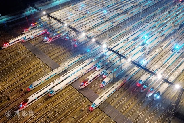 资料图:2019年1月21日,在南京动车段,动车组列车整装待发(无人机拍摄)。图自澎湃影像