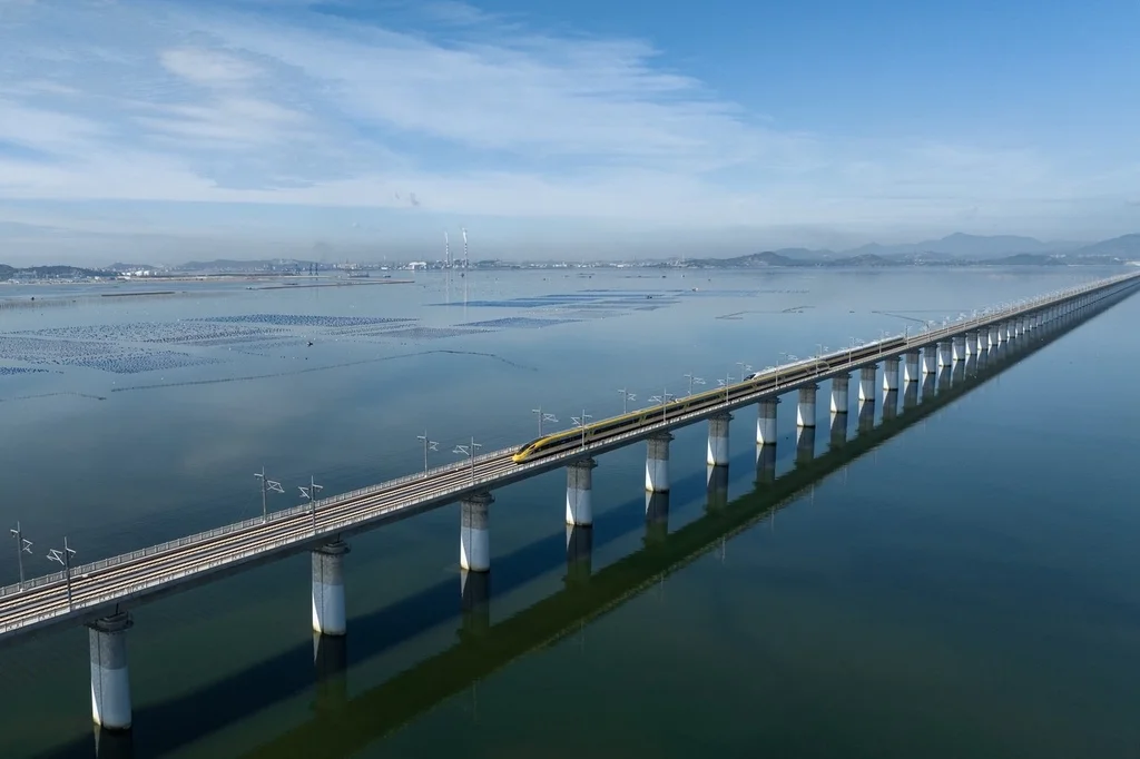 去年6月28日,在湄洲湾跨海大桥,试验列车交会运行。图自IC Photo