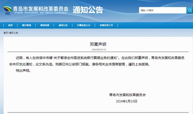 青岛市发改委网站10日发布公告称,近期,有人在微信中传播“关于暂停全市国资系统银行票据业务的通知”。在此郑重声明,青岛市发展和改革委员会未印发此通知,此文系伪造。我委已向公安部门报案。请各相关主体提高警惕,谨防上当受骗。