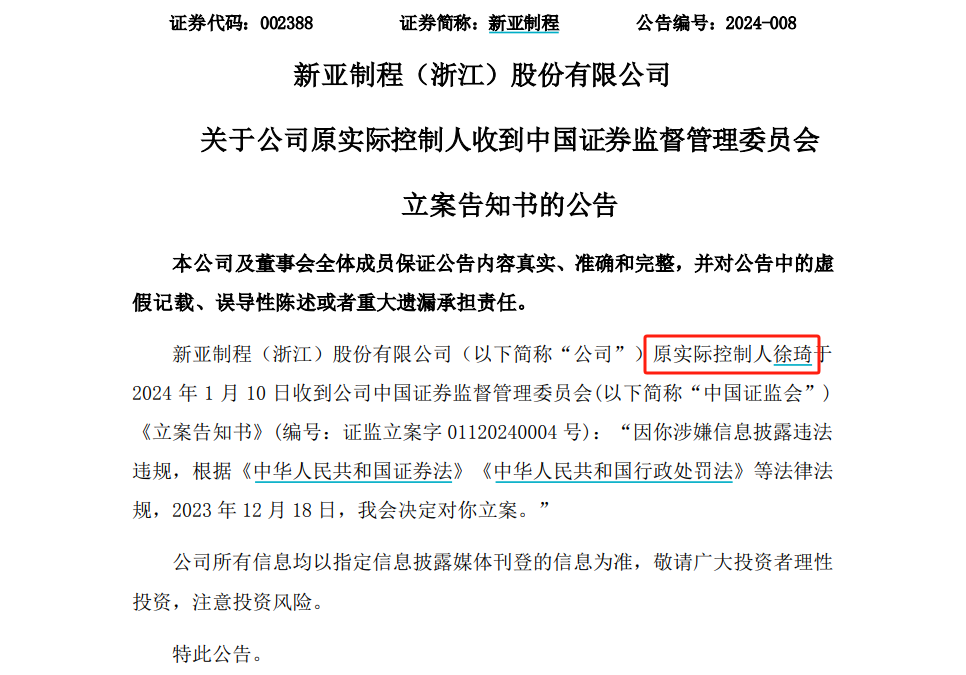 监管出手!因涉嫌信息披露违法违规,新亚制程及公司原实际控制人徐琦遭证监会立案调查。
