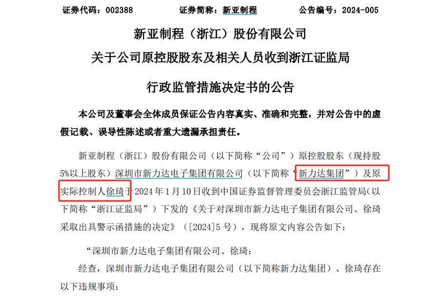 此外,新亚制程原控股股东(现持股5%以上股东)新力达集团及原实际控制人徐琦同样收到警示函。