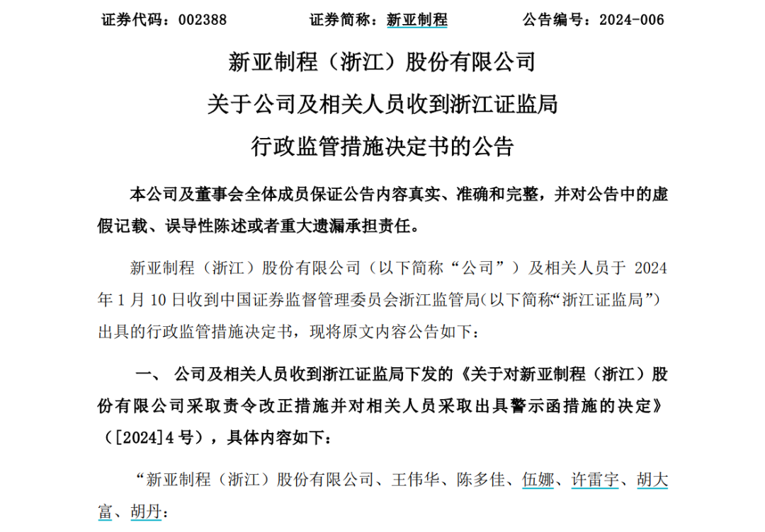 根据相关规定,浙江证监局决定对新亚制程采取责令改正的行政监管措施,对时任董事长许雷宇、时任总经理胡大富、董事会秘书伍娜、时任财务总监胡丹、董事长兼总经理王伟华、财务总监陈多佳分别采取出具警示函的监督管理措施,并计入证券期货市场诚信档案。