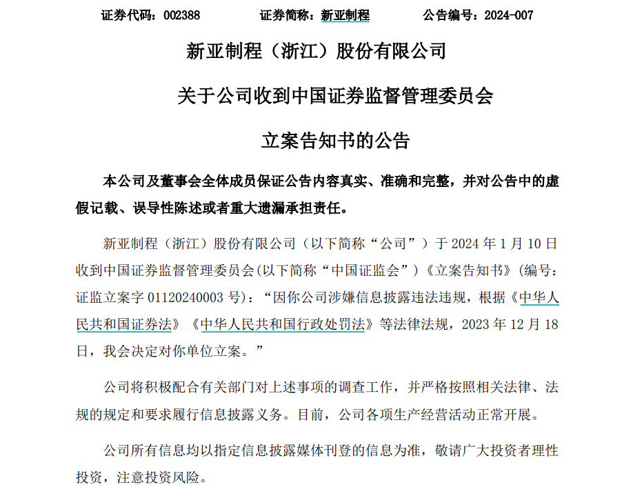 1月10日晚间,新亚制程发布公告称,公司收到中国证监会《立案告知书》(编号:证监立案字01120240003号):“因你公司涉嫌信息披露违法违规,根据《中华人民共和国证券法》《中华人民共和国行政处罚法》等法律法规,2023年12月18日,我会决定对你单位立案。”