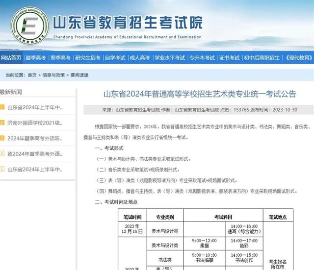 根据《山东省2024年普通高等学校招生艺术类专业统一考试公告》,2024年山东省普通高校招生艺术类专业中的美术与设计类、书法类、舞蹈类、音乐类、播音与主持类和表(导)演类专业实行省级统一考试。笔试时间为2023年12月16日至17日,面试时间为2023年12月20日至30日。其中,美术与设计类采取笔试形式,考试科目包括速写、素描、色彩等。