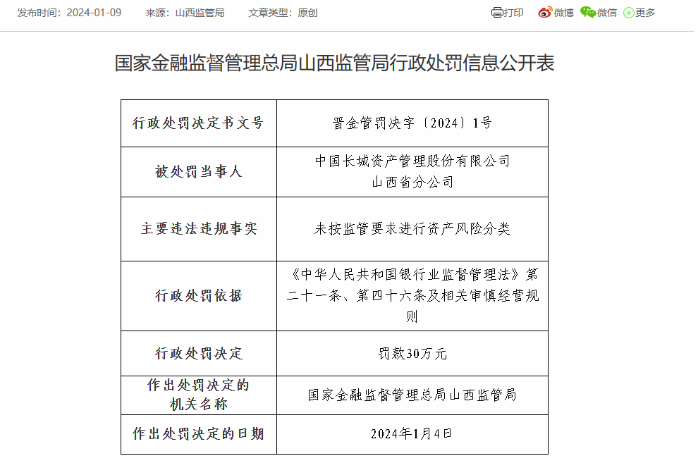 1月9日,国家金融监督管理总局山西监管局发布晋金管罚决字【2024】1号行政处罚决定书显示,中国长城资产管理股份有限公司山西省分公司因未按监管要求进行资产风险分类,被罚30万元;作出处罚决定的日期为2024年1月4日。