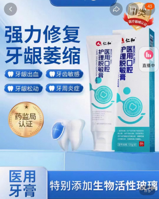 尽管其表示相关产品不是牙膏,但记者注意到,该直播间写着“医用牙膏”的字样。在多个产品宣传页,也使用了“医用牙膏”进行宣传。
