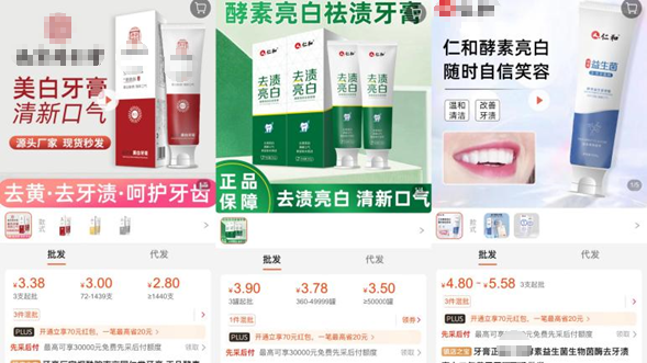 记者在网络批发平台上看到,有多个自称代工知名老品牌的牙膏产品在售。单只售价从三元到六元不等,如果订购量大价格还有优惠空间。
