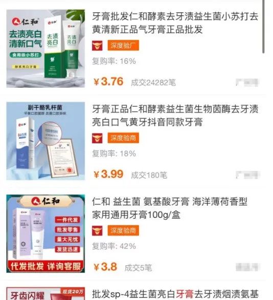 以“仁和”品牌为例,电商平台上就有仁和酵素益生菌牙膏、仁和匠心牛磺酸净齿液体牙膏、仁和匠心海盐酵素净齿牙膏等多个产品在售,售价从10元/支到60元/支不等。