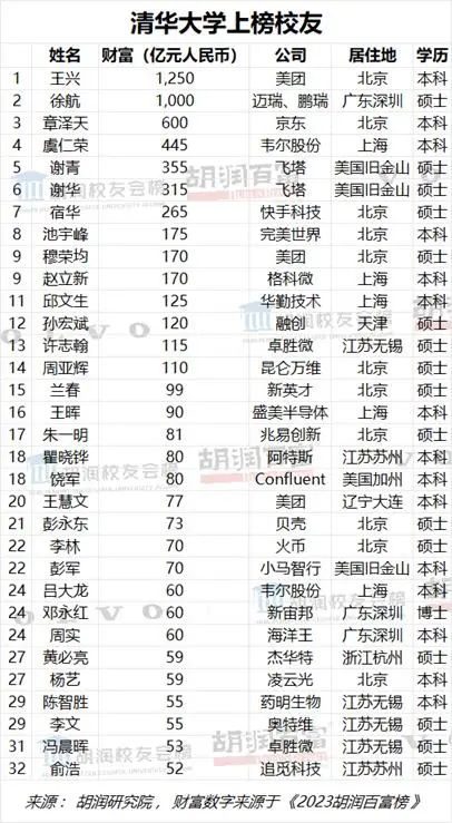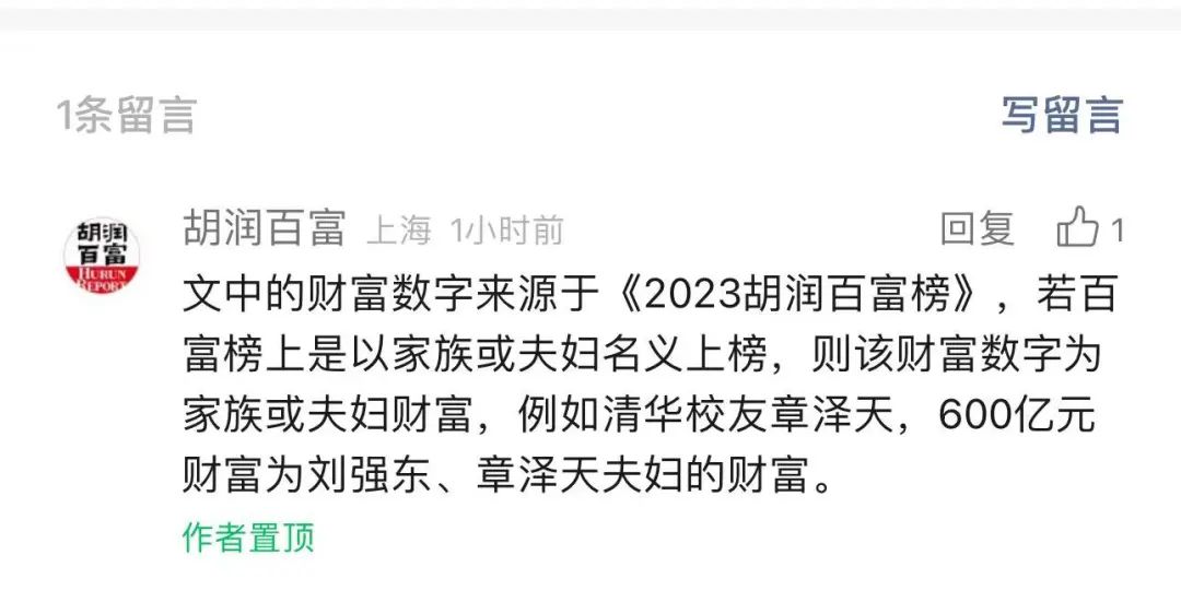对此,1月9日,胡润百富微信公号在“校友会榜发布”一文下留言称:“文中的财富数字来源于《2023胡润百富榜》,若百富榜上是以家族或夫妇名义上榜,则该财富数字为家族或夫妇财富,例如清华校友章泽天,600亿元财富为刘强东、章泽天夫妇的财富。”