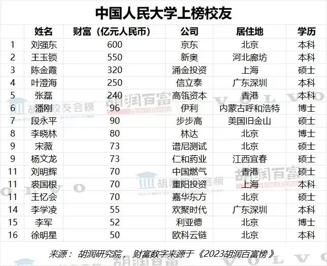 据该份榜单,在中国人民大学上榜校友名单中,刘强东以600亿元排第一。