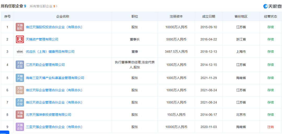 天眼查App显示,章泽天关联9家公司,8家为存续状态,多担任股东、董事长等职务,行业涉及文化艺术、资本市场服务等。值得关注的是,章泽天3家公司与刘强东存在商业关联,其中宿迁天强股权投资合伙企业(有限合伙)注册资本达1亿元,刘强东、章泽天分别持股89.01%、9.99%。