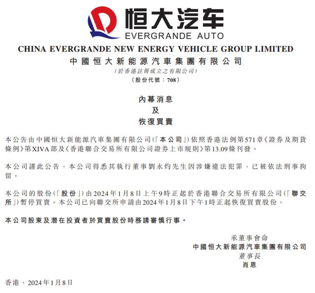 1月8日,恒大汽车在港交所发布公告称:本公司得悉公司执行董事刘永灼先生因涉嫌违法犯罪,已被依法刑事拘留。