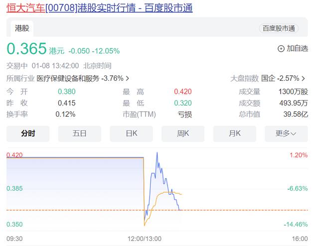 在恒大汽车复牌后,股价巨震,截至完稿,已跌超12%。