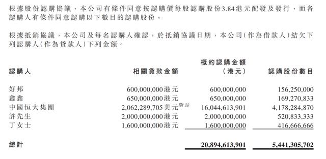 其中,许家印认购了20亿港元的新股份(约合人民币18.6亿元),许家印前妻丁玉梅认购16亿港元新股份。此外,鑫鑫作为许家印的关联公司认购了6.5亿港元,而好邦作为丁玉梅的关联公司认购了6亿港元。