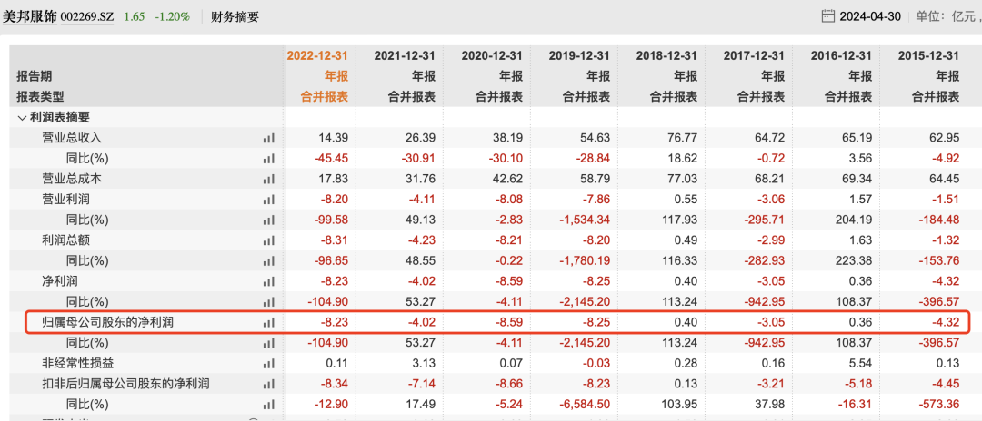 自2012年起,美邦服饰就开始走下坡路。财报数据显示,美邦服饰自2012年起营业收入和净利润每况愈下,2015年首次出现亏损。而胡佳佳的接班并未能改变美邦服饰发展的下行通道,在2016年短暂扭亏后,2017年,胡佳佳接手的第一个完整财年,美邦服饰再次出现亏损,归母净亏损3.05亿元,此后,除了2018年实现盈利,从2019年至2022年,美邦服饰连续出现亏损。根据美邦服饰2022年财报,公司2022年实现营收14.39亿元,归母净亏损8.23亿元。