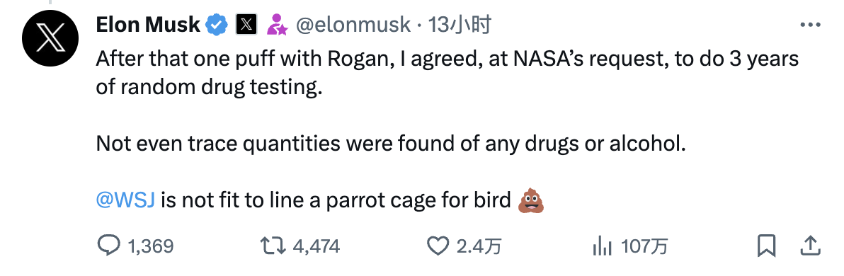 1月7日,马斯克发文称,“在Rogan的节目上吸了一口后,我就同意按照NASA的要求进行了为期3年的随机药物检测,从未发现任何微量的毒品或酒精。《华尔街日报》连给鹦鹉笼里的鸟当厕纸都不配。”