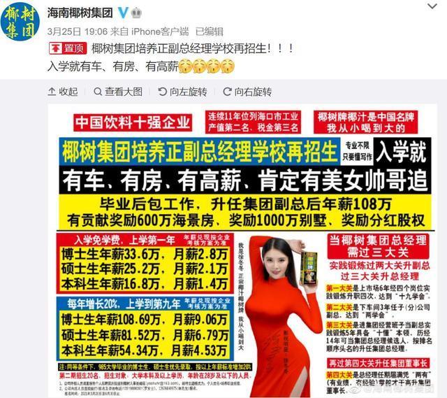 2021年3月,椰树集团又因一则招聘广告遭到质疑。在这则引发争议的招聘广告中,除了可以看到“中国饮料十强企业”“连续11年位列海口市工业产值第二名、税金第三名”“ 椰树牌椰汁是中国名牌”等这类常规介绍外,还能看到“入学就有车、有房、有高薪、肯定有美女帅哥追”“毕业后包工作,升任集团副总后年薪108万”“有贡献奖励600万海景房,奖励1000万别墅,奖励分红股权”等极具噱头的宣传。