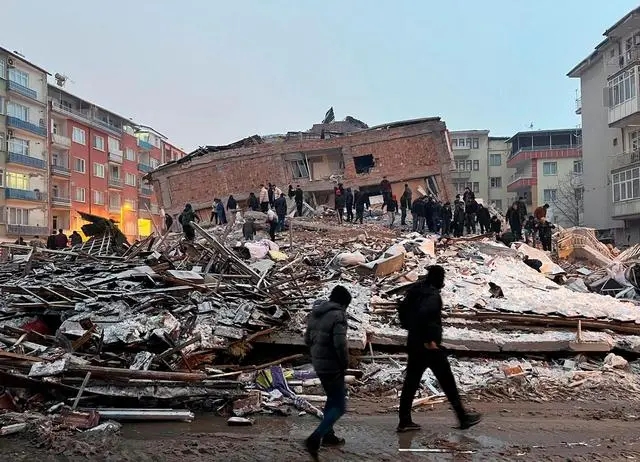 2月6日,人们聚集在土耳其马拉蒂亚一处倒塌的建筑附近。 新华社发(穆斯塔法·卡亚摄)