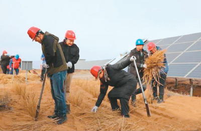 在宁夏腾格里沙漠新能源基地,台商台青们了解到在沙漠上建设光伏电站可以减弱沙丘流动、减少沙漠水分蒸发量,光伏板组件下还可以扎半隐蔽式麦草方格,种植沙蒿、沙米等沙生植物固沙,并培育西红柿、辣椒等农作物,实现“板上发电、板间种植、板下修复”。“这真是一举三得,沙漠光伏项目为经济社会发展插上了腾飞的‘绿色翅膀’。”台青张耀霖说。