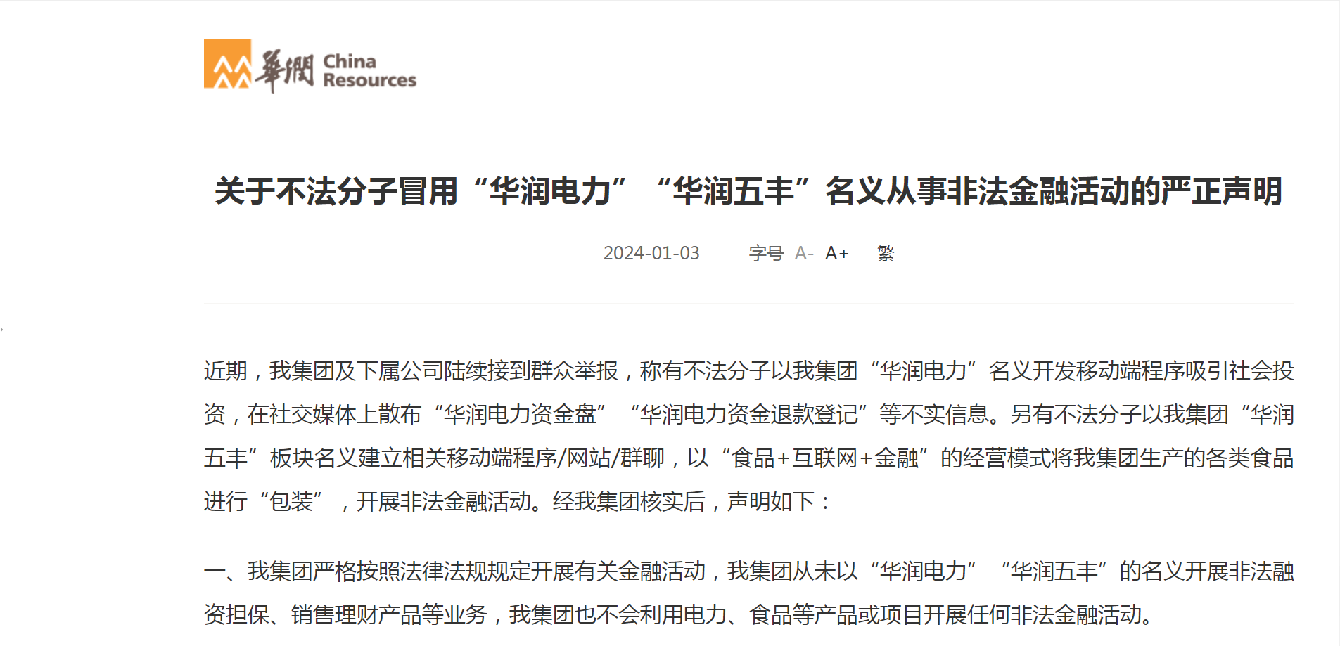 华润集团发布《关于不法分子冒用“华润电力”“华润五丰”名义从事非法金融活动的严正声明》