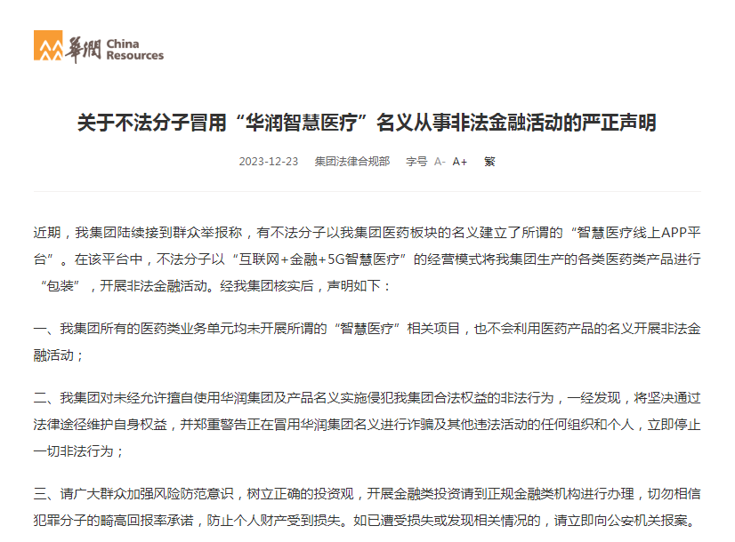 2023年12月9日晚,华润集团在官网发布两则声明称,陆续发现有不法分子将企业注册为华润集团下属公司,并有企业冒称华润集团子公司,在多地开展不法经营活动。