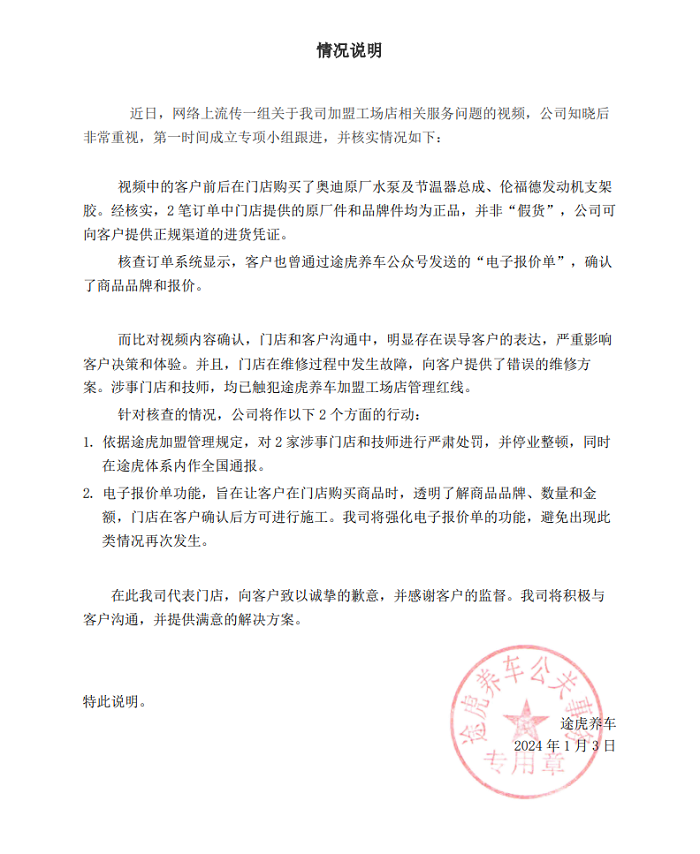 1月3日,途虎养车针对旗下加盟工场店出现的相关服务问题发布声明称,对2家涉事门店和技师进行严肃处罚,并停业整顿,同时在途虎体系内作全国通报。