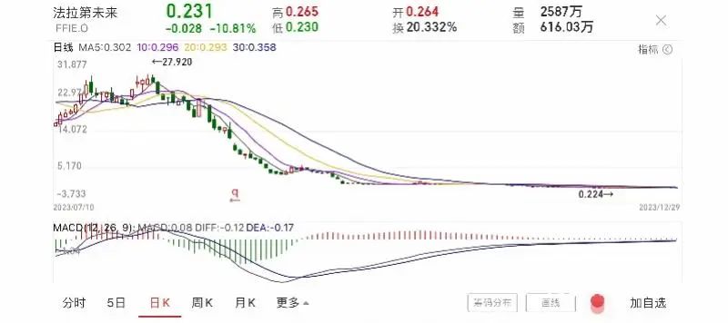 截至当地时间12月29日收盘,法拉第未来报收0.23美元/股,再跌超10%。今年以来,法拉第未来股价已跌99%。