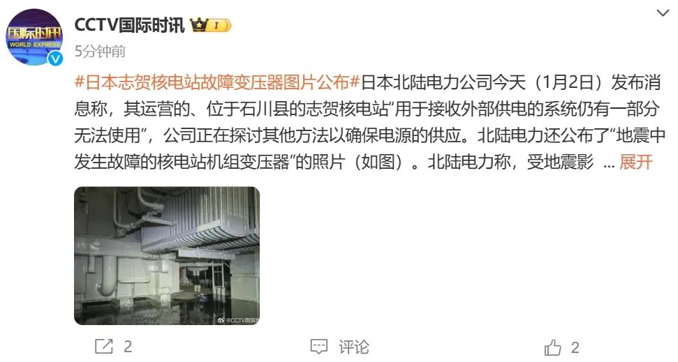 1月2日,日本北陆电力公司发布消息称,其运营的、位于石川县的志贺核电站“用于接收外部供电的系统仍有一部分无法使用”,公司正在探讨其他方法以确保电源的供应。北陆电力还公布了“地震中发生故障的核电站机组变压器”的照片。