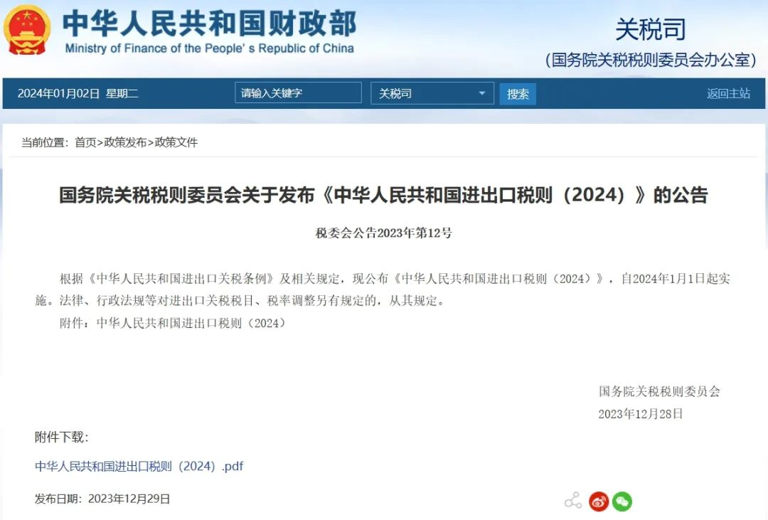 2023年12月29日,国务院关税税则委员会公布《中华人民共和国进出口税则(2024)》,自2024年1月1日起实施。相对于之前发布的公告,本次公布了进出口产品具体的税则,其中包含煤炭。