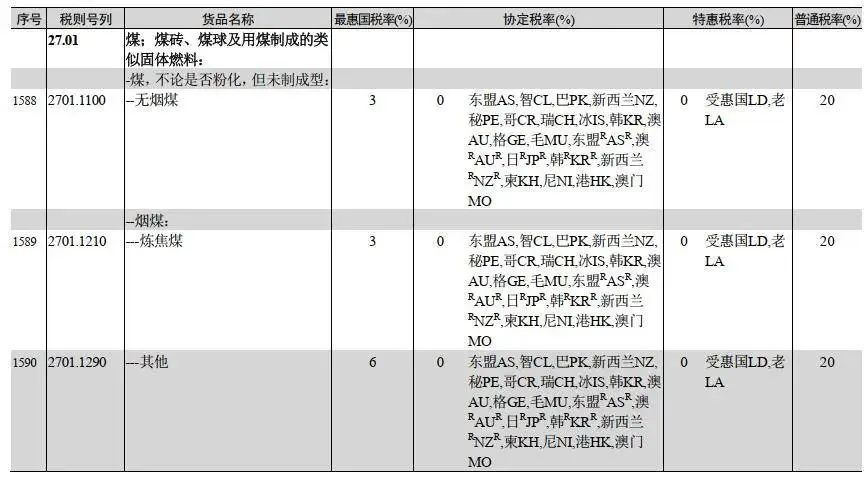 按照自贸协定,来自澳大利亚、印尼的进口煤适用的是协定税率,均为0;来自包括俄罗斯、美国、南非、蒙古等在内的其他国家的进口煤实行最惠国税率。