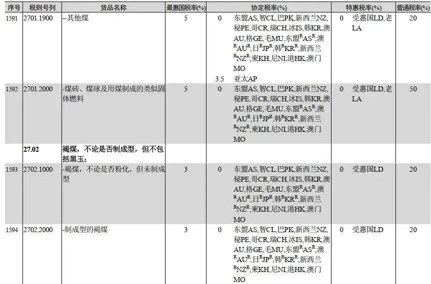 税则显示,2024年1月1日起,恢复煤炭进口关税。普通税率为20%;特惠税率为0;协定税率基本为0;最惠国税率中,无烟煤、炼焦煤、褐煤为3%,其他煤为6%。