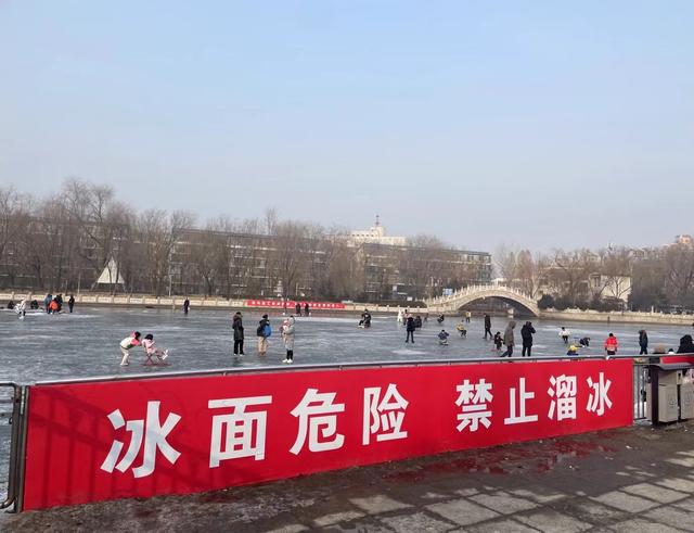“冰薄危险,为了您的人身安全,请远离冰面。”河道北侧,北京市城市河湖管理处拉起的红色横幅十分醒目,但似乎无济于事。一名家长让不到三岁的女儿蹲在铁锹上,拖着她在冰面上跑动。从铁锹上下来后,小女孩很快被冰面上的一个冰窟窿吸引,兴致勃勃地要去踩水玩。