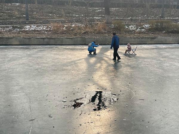 向西走去不远,冰面化出一大片水,边缘冰面薄如蝉翼。一对年轻父母并未当回事,还是一趟趟地推着女儿来回滑冰车。看到年幼的女儿可以自己滑起来,妈妈兴奋地掏出手机,边后退边给女儿录视频,丝毫没有顾及身后冰面是否结实。