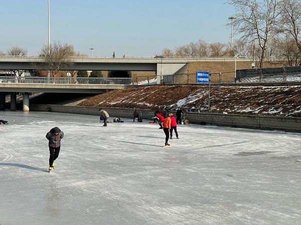 上午11点多,位于西四环中路辅路西侧、阜石路南侧的永定河引水渠上十分热闹。站在河边的永定河路上,就能望见冰面上有很多人正在“滑野冰”,其中既有身姿矫健的成年人,也有踉踉跄跄的儿童。东西两侧冰面上,分别有一个临时摆放的木梯和木椅。