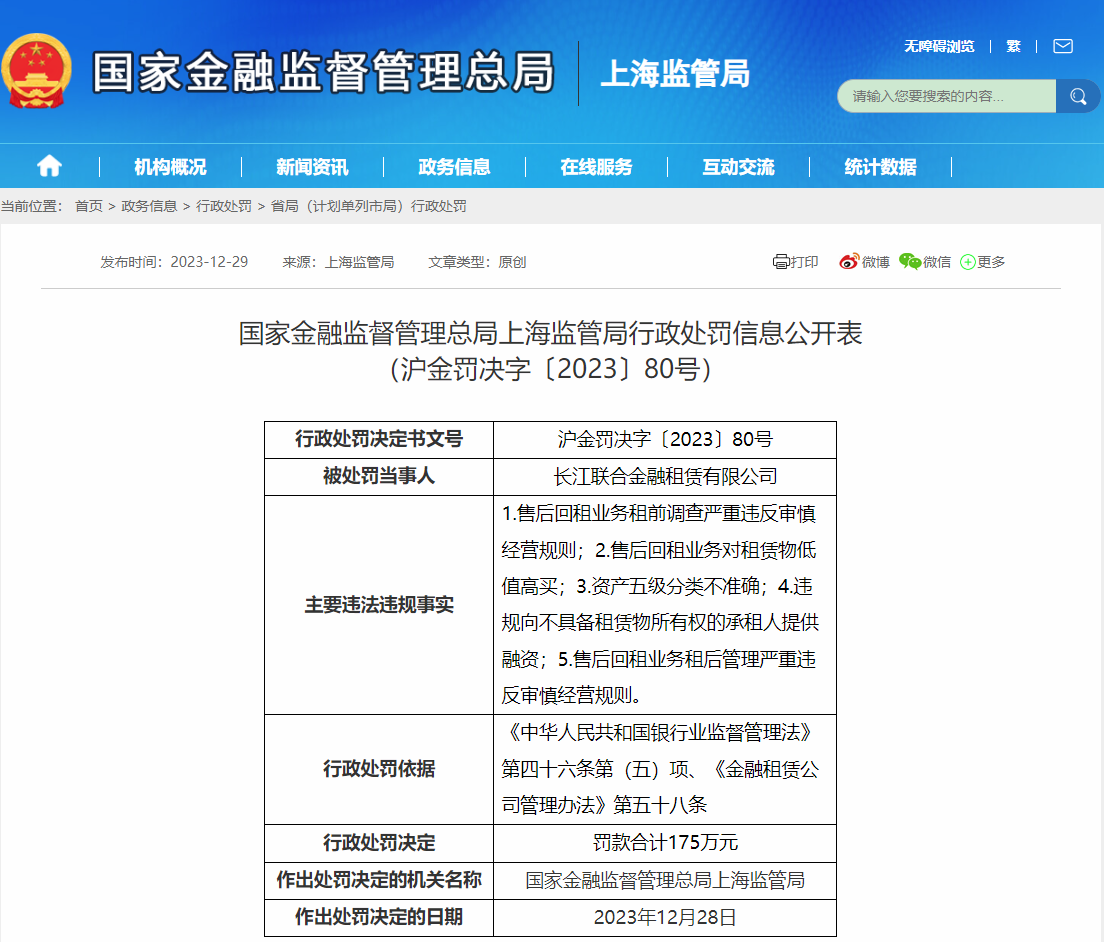 日前,国家金融监管总局公布相关处罚信息显示,长江联合金融租赁有限公司(简称:长江联合金租)因存在售后回租业务租前调查严重违反审慎经营规则、售后回租业务对租赁物低值高买等违规,金融监管总局上海监管局依据《中华人民共和国银行业监督管理法》第四十六条第(五)项、《金融租赁公司管理办法》第五十八条,对其处以罚款合计175万元。