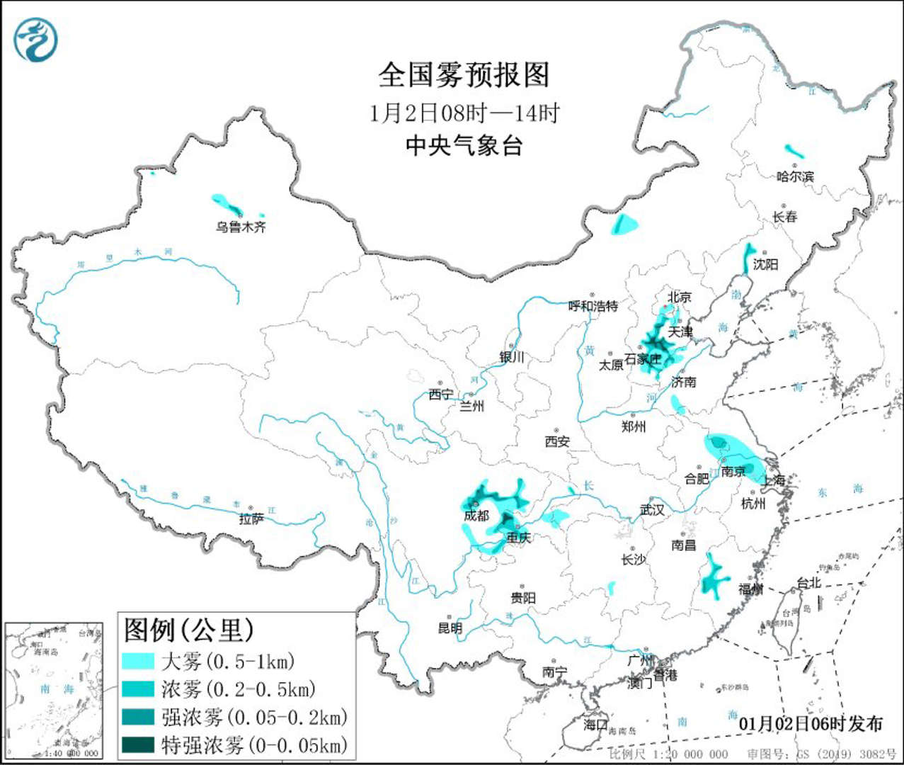 中央气象台1月2日06时继续发布大雾黄色预警:预计,1月2日早晨至上午,北京东南部、天津西部、河北南部、山东西部、江苏西部、安徽东北部、四川盆地大部、福建西部、辽宁中部、新疆天山北坡等地的部分地区有大雾天气,其中河北南部、四川盆地西部和中部、辽宁中部、新疆天山北坡等地有能见度低于200米的强浓雾,局地有能见度低于50米的特强浓雾。