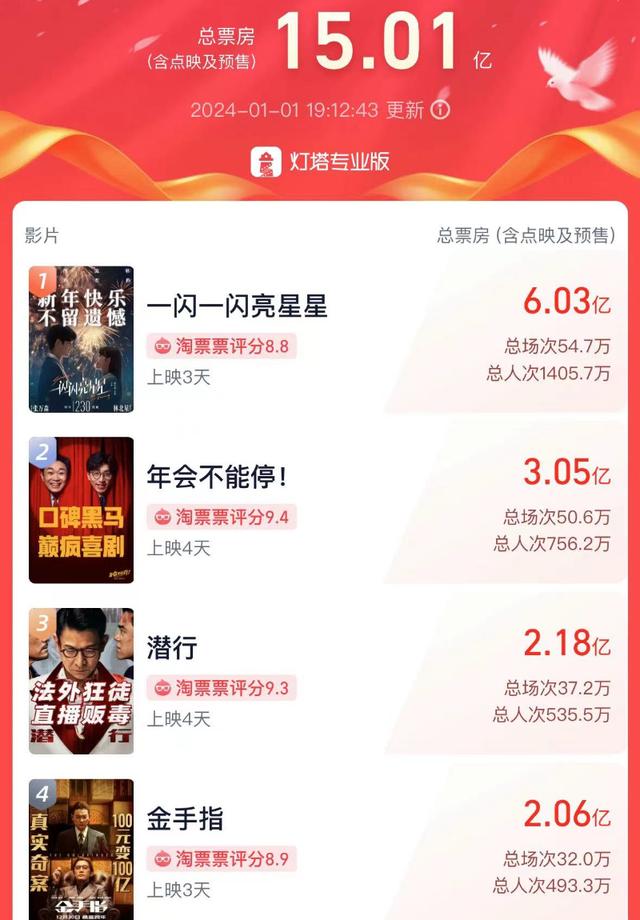 据灯塔专业版数据,截至1月1日19时许,2024元旦档总票房超15亿元。票房排在前三名的电影分别为《一闪一闪亮星星》《年会不能停!》《潜行》。其中《一闪一闪亮星星》票房破6亿元,《年会不能停!》破3亿元,《潜行》则超过2.18亿元。