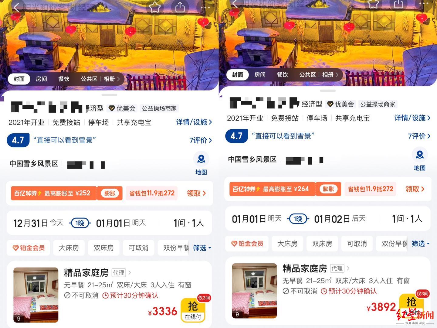 一家地理位置在雪韵大街的客栈预订信息显示,如要在2023年12月31日入住,2024年1月1日退房,预订一间21~25平方米的家庭房,价格达3336元。而如果2024年1月1日入住1月2日退房,同样的房型价格则升至3892元。换言之,该酒店同一房型一夜间涨价556元。