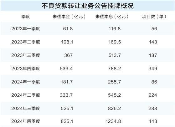 银登中心数据显示,2024年,共计2861.9亿元不良贷款挂牌转让,较2023年增加1273.7亿元,增幅达80.2%;全年挂牌项目数量合计1041单,较2023年的735单增幅超四成,平均每天都有三笔资产上架交易。