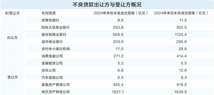 对地方资产管理公司(AMC)来说,“骨折”出售的不良资产,则有着不可抵抗的吸引力。银登中心数据显示,截至2024年末,地方AMC共受让不良贷款未偿本息1639.5亿元,占全年未偿本息成交规模的七成,为最主要的不良资产受让方。