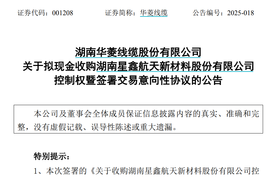 目前各方已经初步确定了收购计划。华菱线缆公告称,3月14日公司召开五届董事会第二十六次会议,审议通过了《关于拟现金收购湖南星鑫航天新材料股份有限公司控制权暨签署交易意向性协议的议案》。