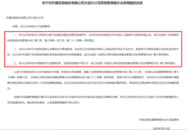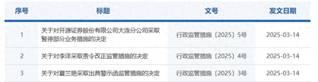 3月14日,大连证监局发布3张罚单,开源证券大连分公司被责令限期改正,并被采取暂停办理需要合格投资者认定相关业务六个月的监督管理措施;该分公司负责人李洋被采取责令改正监管措施;从业人员夏兰艳被采取出具警示函监管措施。